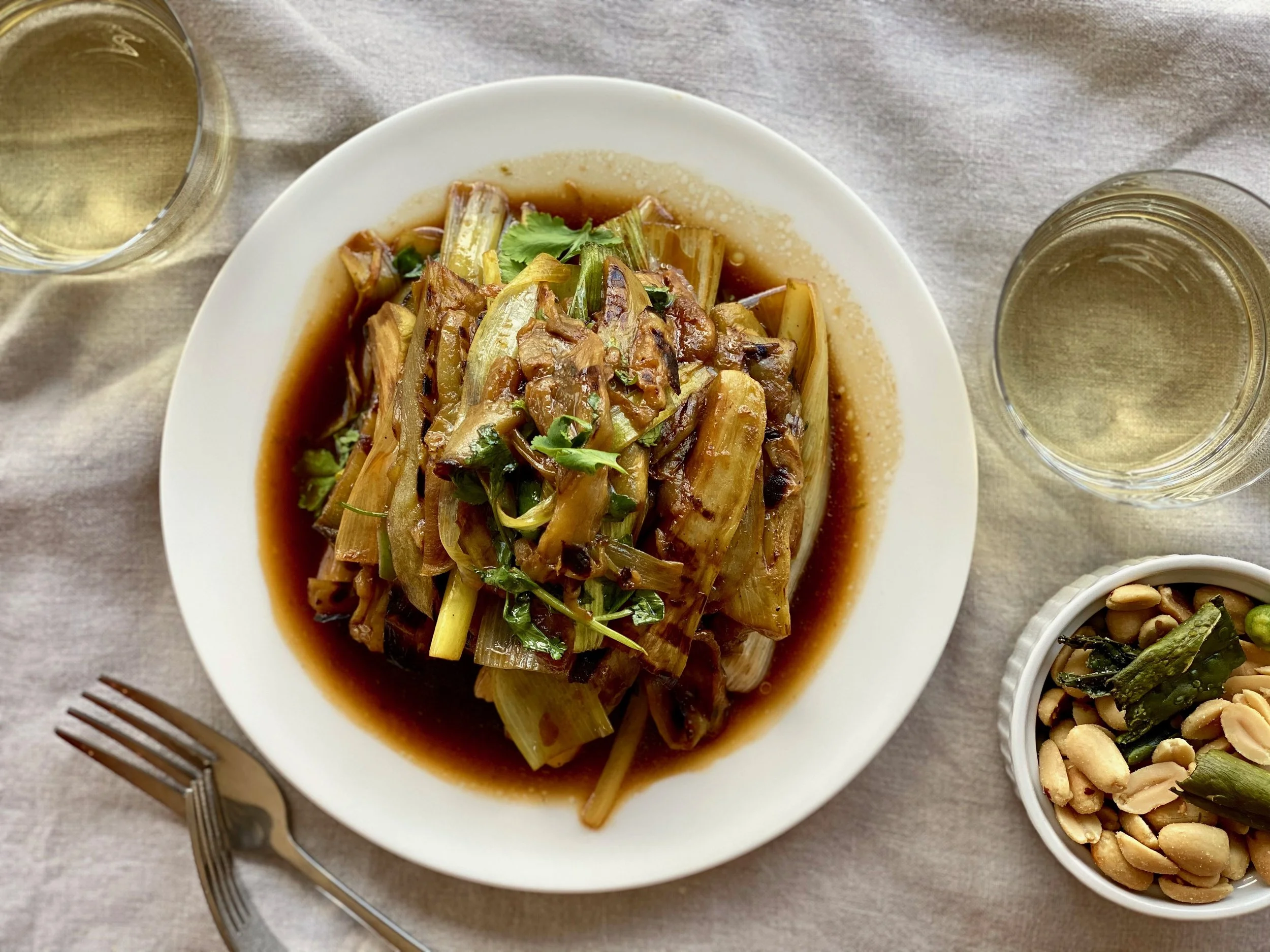 3. Get a grill over medium heat. Start grilling the eggplant and the leeks, depending on the size of your grill, or in batches.