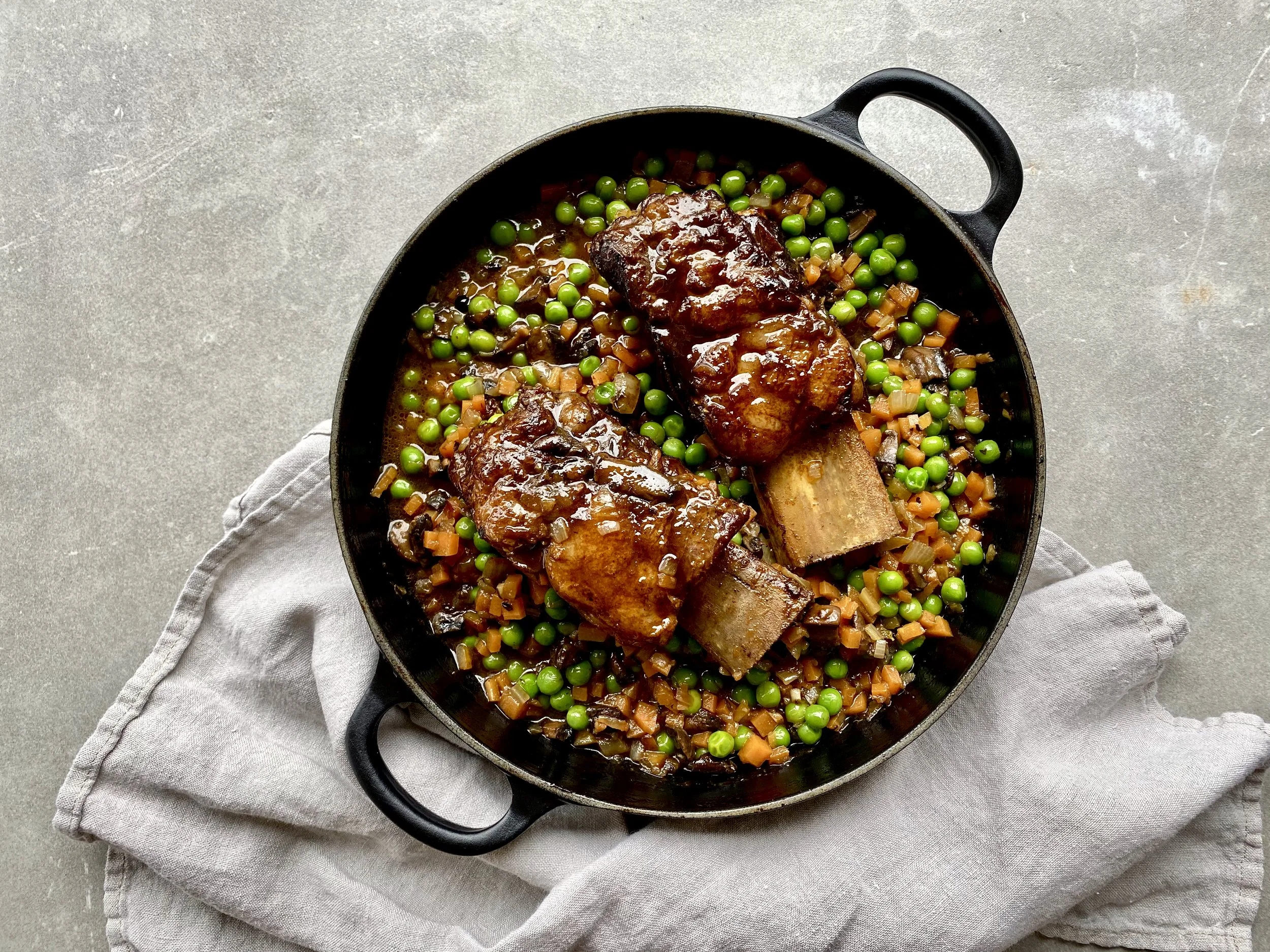 4. Place the short ribs on top of the carrot & pea stew, keep covered.5. Once the beef jus has reduced by at least half, it should be syrupy and silky. Generously (for whats left of it, probably a couple of tablespoons) pour it over the ribs to glaze them.